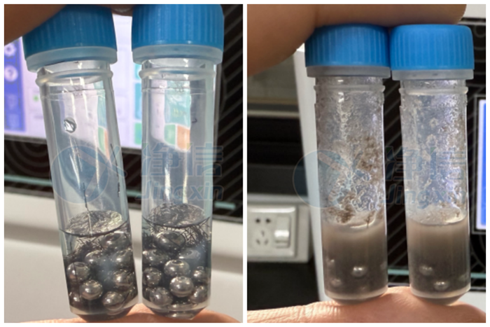 毛發(fā)樣品研磨前后對比,1分鐘內(nèi)可以研磨到勻漿狀態(tài)