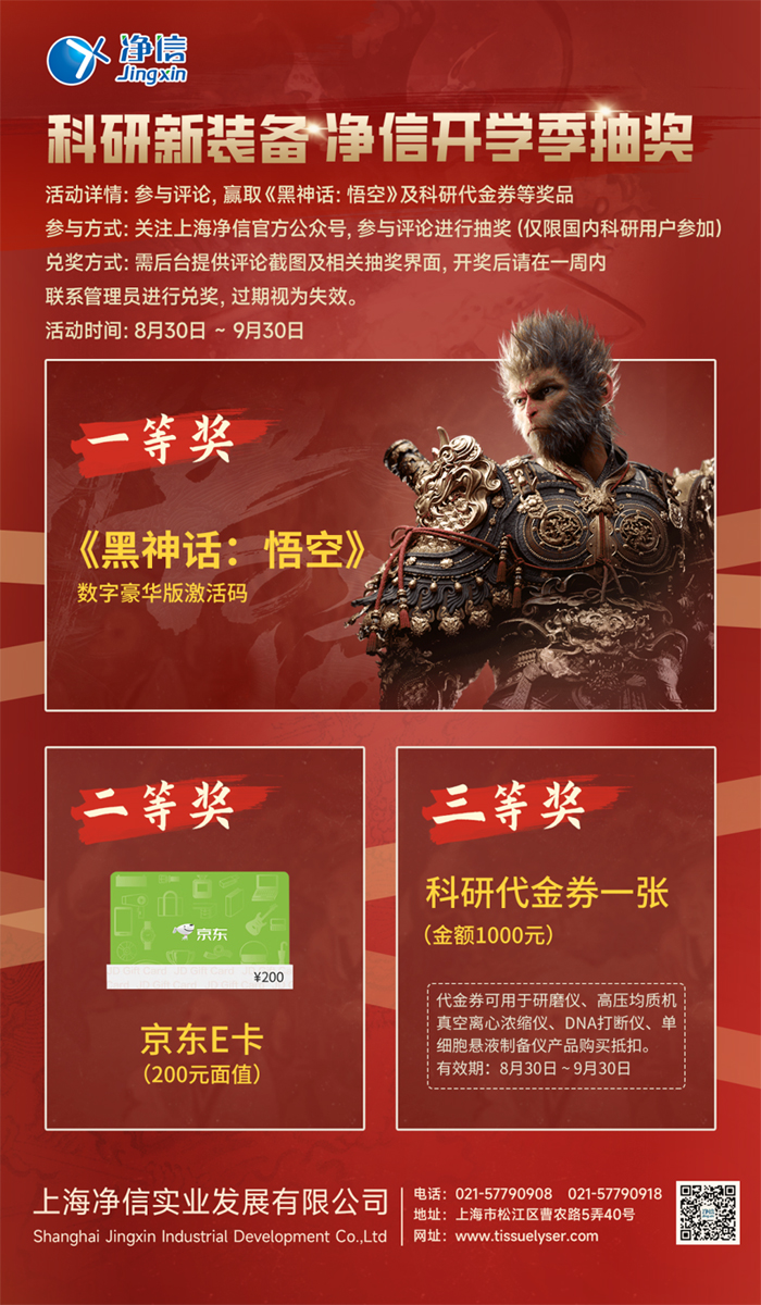 親愛的科研伙伴們,新學期伊始,是不是感覺你的實驗室還缺點什么?上海凈信來幫你補齊裝備!參與我們的開學季抽獎活動,就有機會獲得《黑神話:悟空》數(shù)字豪華版激活碼,讓你的科研生活不再單調(diào)。不僅如此,還有京東E卡科研代金券等你來拿,讓你的科研之路更加順暢!
