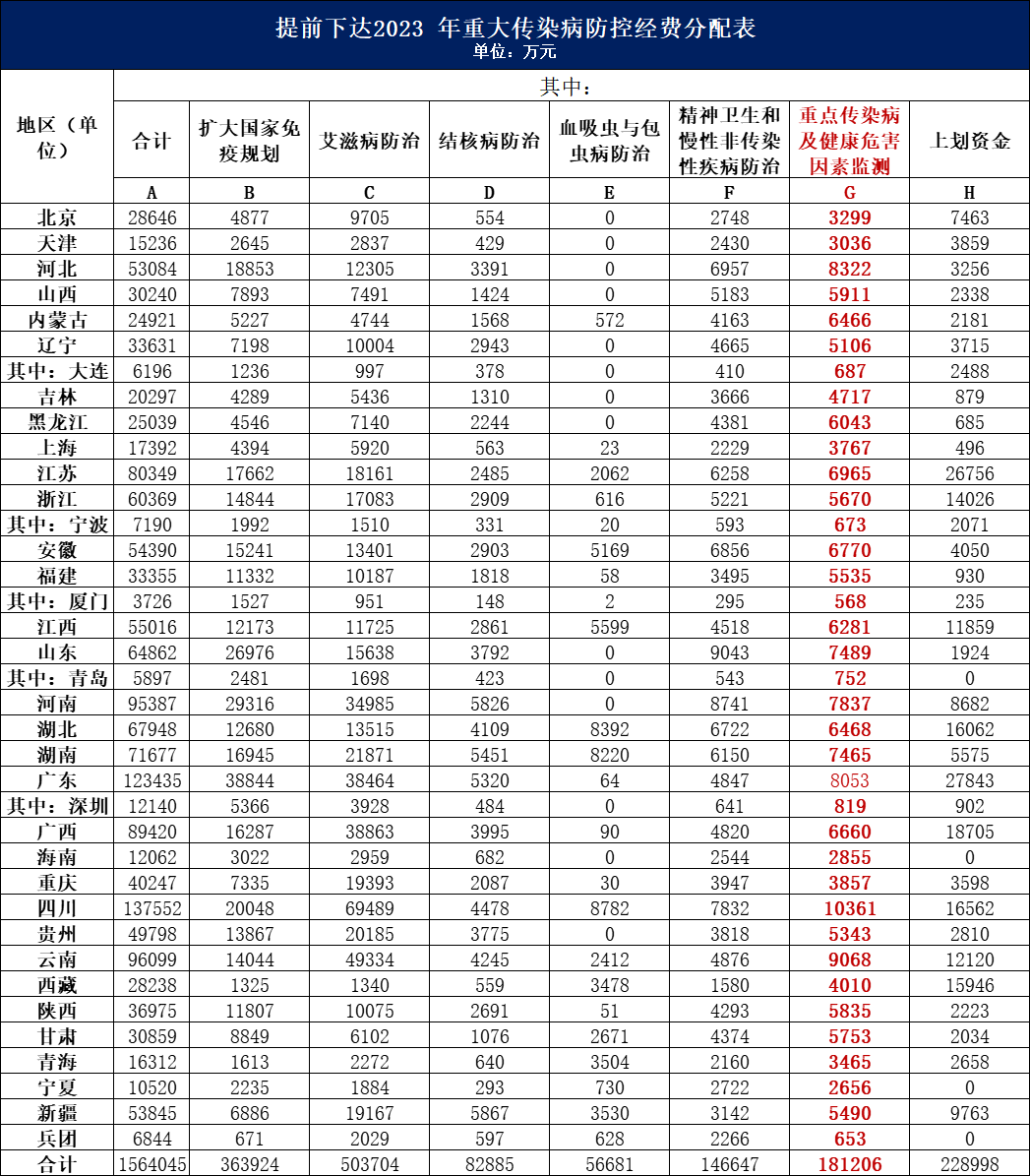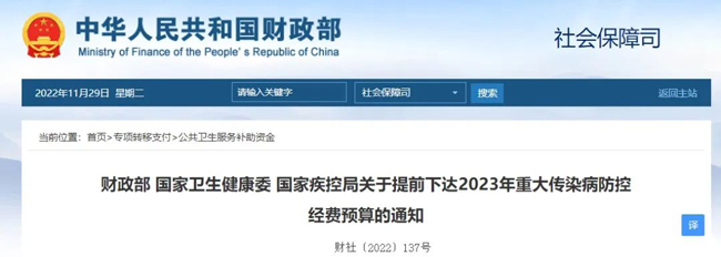 日前,國家財政部、國家衛(wèi)生健康委、國家疾控局三部門聯(lián)合發(fā)布了《財政部 國家衛(wèi)生健康委 國家疾控局關(guān)于提前下達(dá)2023年重大傳染病防控經(jīng)費預(yù)算的通知》。此次提前下達(dá)的2023年重大傳染病防控經(jīng)費共計156.4億元,相較于2022增長31%。