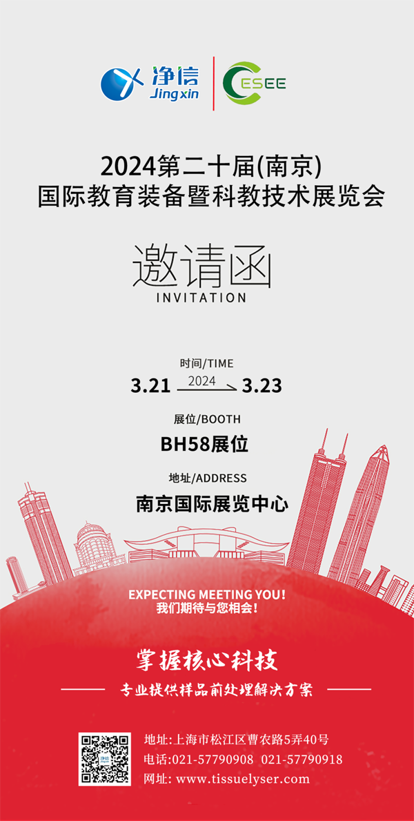 2024年3月21日至3月23日,第二十屆中國南京國際教育裝備暨科教技術(shù)展覽會,將會在南京國際展覽中心舉辦。上海凈信將攜多款新產(chǎn)品出席亮相,包括凈信科研者系列新品、超聲波設(shè)備、研磨設(shè)備等等。誠摯地邀請您前來BH58展位暢談商機,共話樣品前處理的技術(shù)和應(yīng)用。