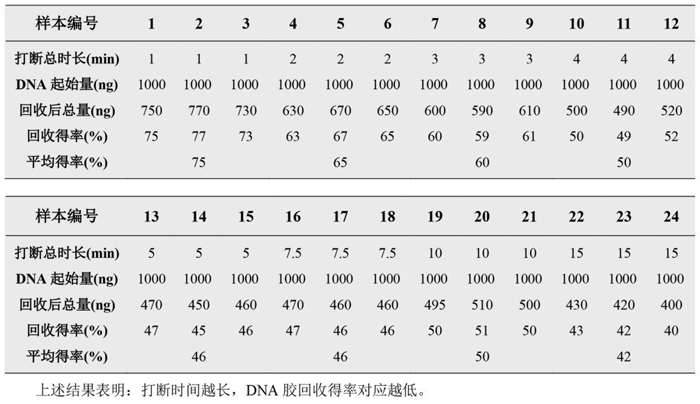 實驗結(jié)果表明:(1) 隨著打斷時間的增加,打斷片段的大小也隨之變小;(2) 相同打斷條件下,打斷效果的重復(fù)性和均一性良好。