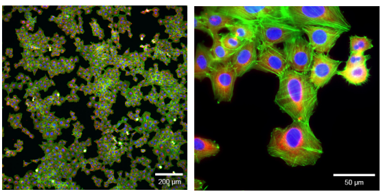 免疫染色Rat1細(xì)胞在μ-Slide 1孔中的寬場熒光顯微鏡。F-肌動(dòng)蛋白細(xì)胞骨架用鬼筆肽(綠色)染色。用α-微管蛋白抗體染色微管(紅色)。用DAPI(藍(lán)色)觀察細(xì)胞核。 圖像是在尼康顯微鏡上用10倍(左)和60倍(右)物鏡拍攝的,后者是浸油的。