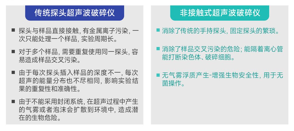 采用超聲波磁致伸縮的原理,把超聲波波形聚焦在液體中,使超聲波能量有質(zhì)的轉(zhuǎn)變。傳統(tǒng)的探頭超聲波破碎儀,探頭與樣品直接接觸,一次只能處理一個(gè)樣品,實(shí)驗(yàn)周期長;對(duì)于多個(gè)樣品,需要重復(fù)使用同一探頭,容易造成樣品交叉污染。由于每次探頭插入樣品的深度不同,每次超聲的能量分布也不盡相同,影響實(shí)驗(yàn)結(jié)果的重復(fù)性和準(zhǔn)確性。此外,由于不能采用封閉系統(tǒng),在超聲過程中產(chǎn)生的氣霧或者泡沫會(huì)擴(kuò)散到環(huán)境中,造成潛在的生物危險(xiǎn)。